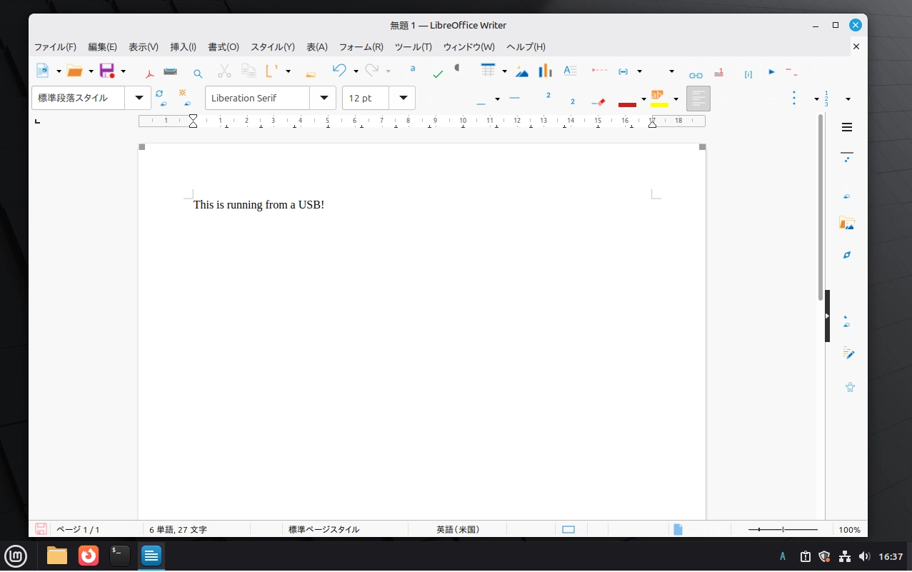 現在、Linux はパソコンの内蔵ストレージではなく、 USB ドライブから起動しています。